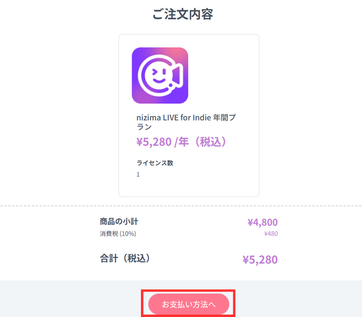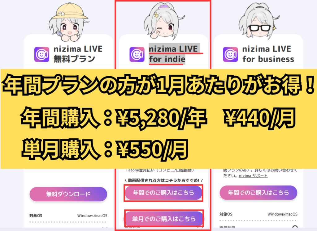 料金プラン画面にて、 ”nizima LIVE for indie” 欄の「年間での購入はこちら」あるいは「単月での購入はこちら」のどちらかをクリック。↓
