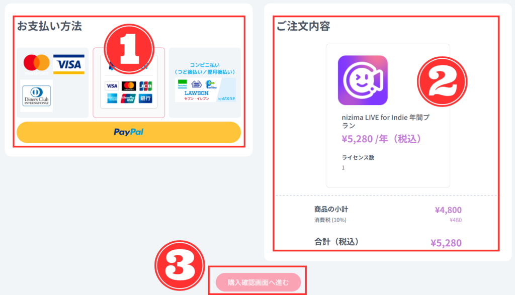 以下画面にて、「①お支払い方法」を選択して必要な情報を入力後、改めて「②注文内容」を確認して、問題無ければ「③購入確認画面へ進む」をクリック。↓