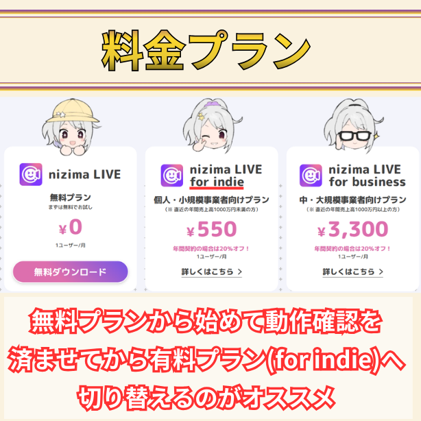 これからVtuber活動を始める方は「nizima LIVE for indie」プランで問題ありません。