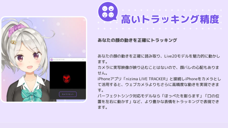 Webカメラで自分の表情や動きを読み取り、Live2Dモデルにリアルタイムで反映させるツールのこと。