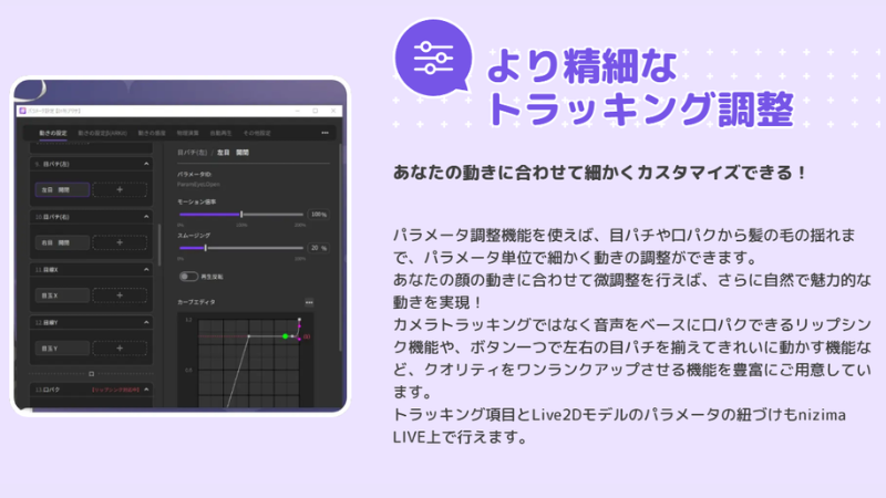 そのため、「設定で悩みたくない」「とにかく手軽に、でも綺麗に動かしたい」という方にとって、nizima LIVEというトラッキングソフトは非常にオススメのソフトです。