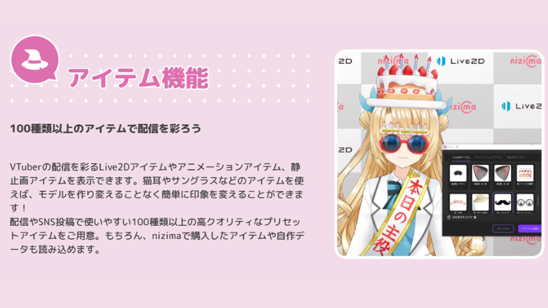 nizima LIVEには、最初から100種類以上のアイテム(帽子、猫耳、面白メガネ、ヒゲなど)が標準搭載されています。