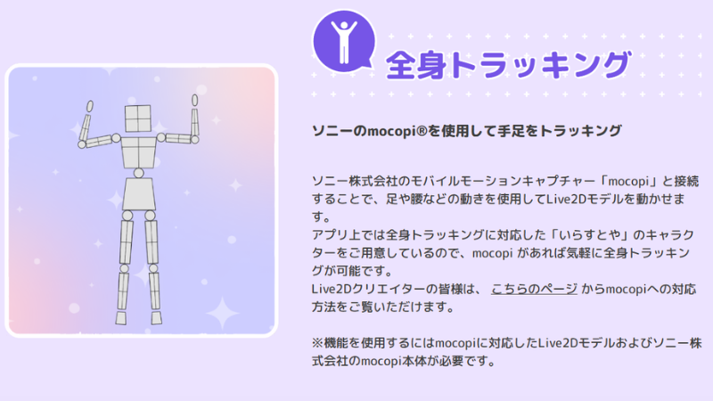 顔だけでなく、体全体を動かしたいなら、Sonyのモバイルモーションキャプチャー「mocopi」との連携が最強です。