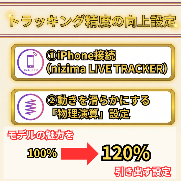 具体的には、PC(nizima LIVE)が「モデルを映して配信する役割」を担い、iPhone(nizima LIVE TRACKER)が「あなたの顔を精密に読み取る役割」を分担する形になります。