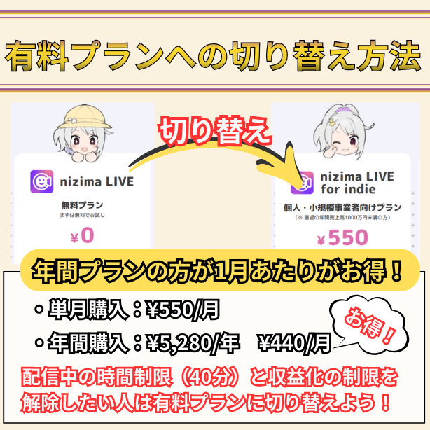 そのため、まずは無料プランで設定や使い方をじっくり試し、配信デビューが決まったタイミングで「有料プラン」へ移行することをおすすめします。
