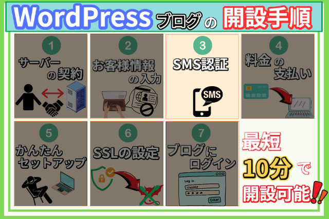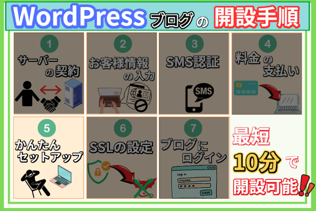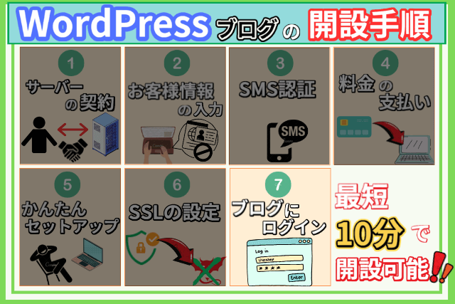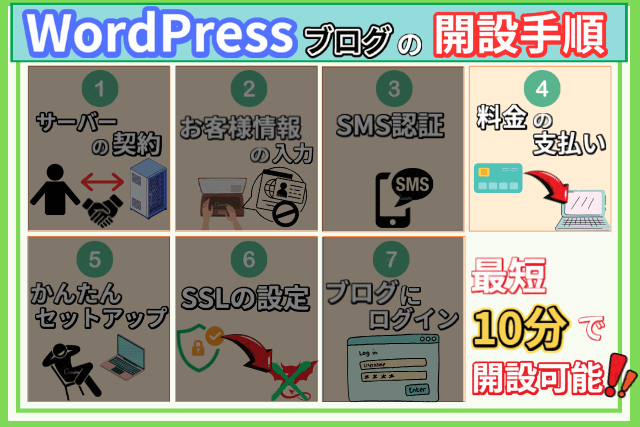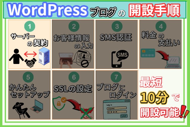 説明に入る前に、WordPressのブログ開設がどのような手順で行われるかイメージしやすい様に、以下画像で簡単にまとめましたので参考にしてください。↓