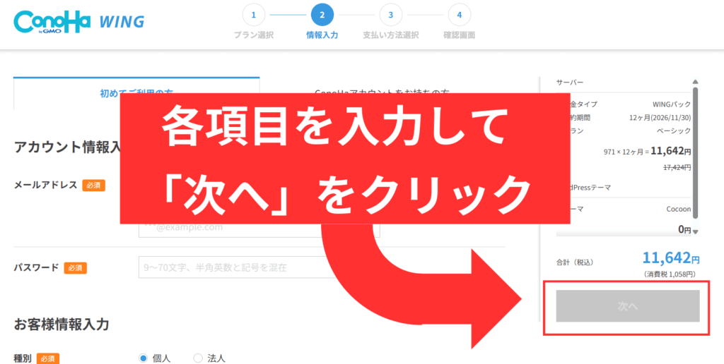 お客様情報の入力画面が表示されたら「各項目」を入力後に「次へ」をクリック。↓