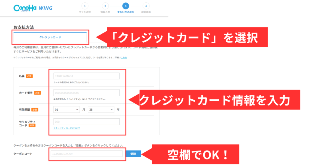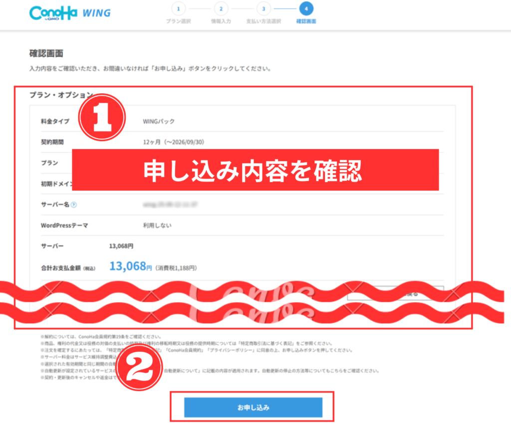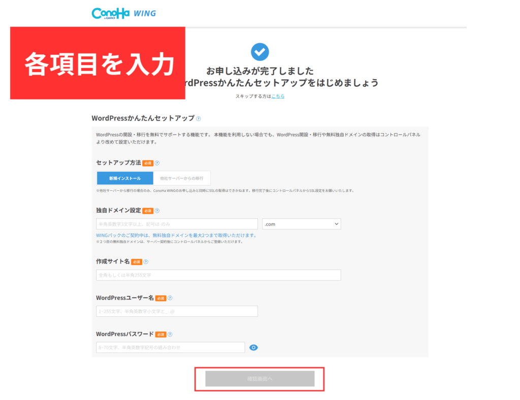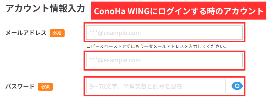 ここで設定するメールアドレス・パスワードは、後でConoHa WINGにログインするときに利用するので、メモしておきましょう。
