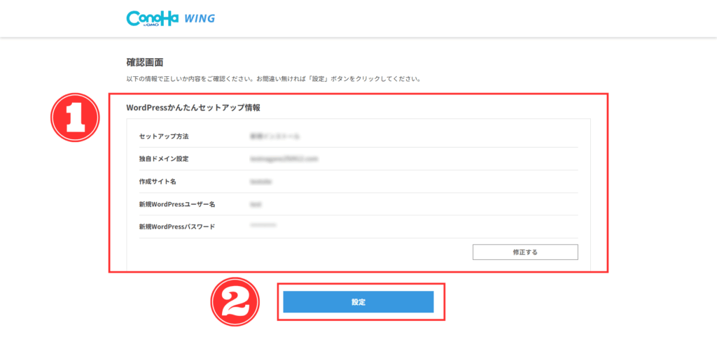 最後に、①「確認画面」の内容をチェックして、問題無ければ②「設定」をクリック。↓