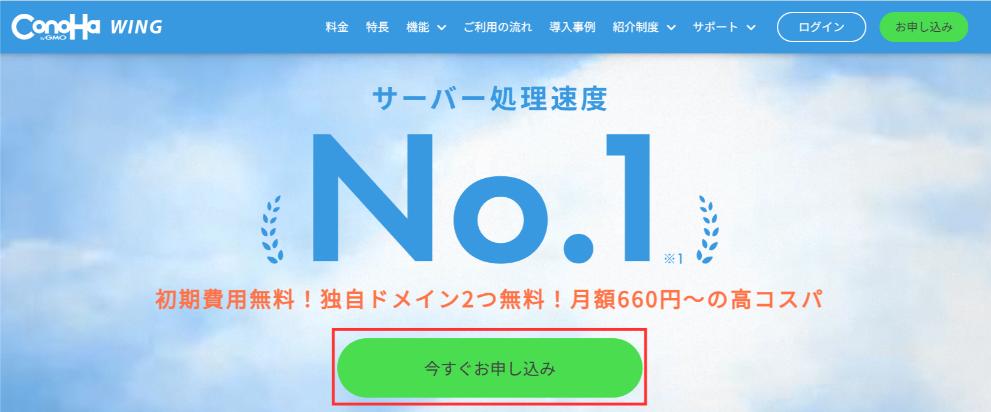 まずは、以下ボタンよりConoHa WINGのサイトにアクセス。↓