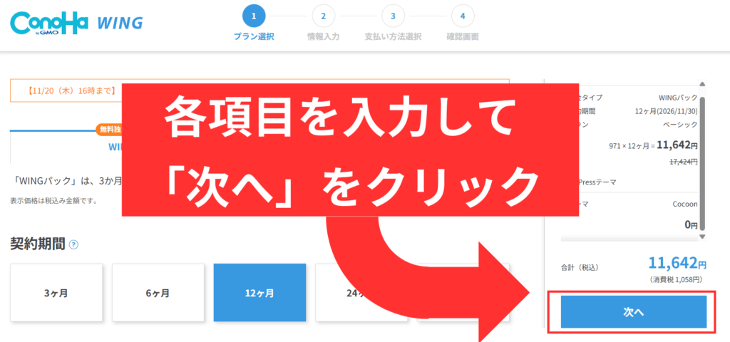 以下画面が表示されたら、「各項目」を入力し「次へ」をクリック。↓
